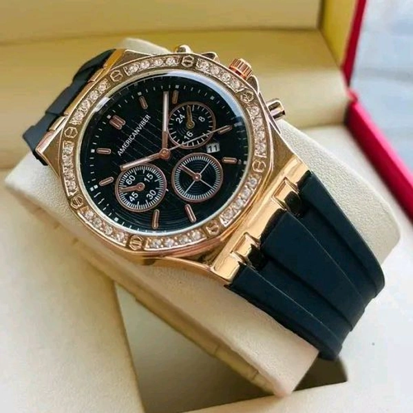 AMERICAN AMBER Luxury Rose Gold Chronograph Watch for Men | Blue Dial Analog Wrist Watch | Diamond Studded Bezel | Silicone Strap | Date Display | Premium Designer Watch